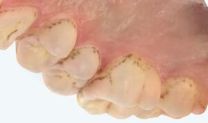見てください。これはしっかりと歯磨きをしている方の写真ですが、歯と歯の間や歯茎の境目に汚れが残っていますよね 。